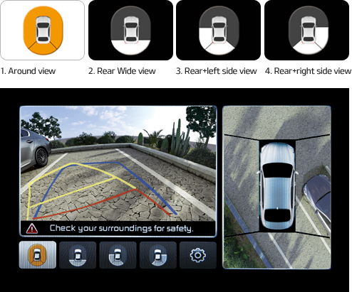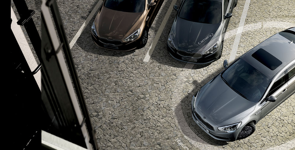 Four cameras located at the front, sides and rear of Quoris provide a 360-degree, virtual bird’s eye image of the car’s location on the display monitor. In conjunction with PGS (Parking Guide System), which uses a steering wheel angle sensor and a rear-view camera to show the predicted trajectory of the vehicle, AVM enables safer and more convenient parking.