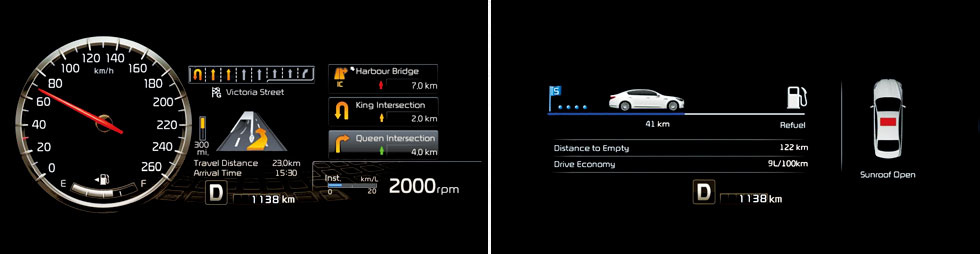 Using Thin Film Transistor (TFT) technology, the high-definition cluster features precise graphics and delivers a wide range of information with remarkable clarity. The display priorities, graphic colors and size can be personalized to suit your preferences.