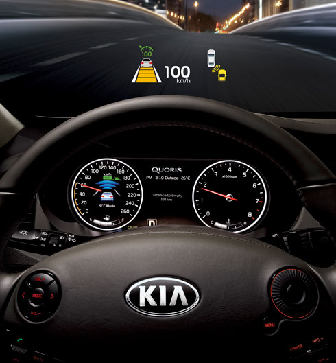 A variety of information including current speed, navigation directions and lane departure warning are discretely projected onto the windshield glass in the driver’s sight line. Brightness of the display is automatically adjusted to suit changing ambient light levels.