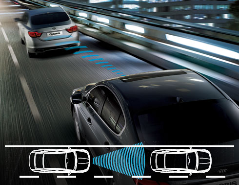 A radar sensor at the front of the car monitors the gap between the vehicle ahead. The system automatically applies the brakes to maintain a pre-determined ‘safe’ distance and will even bring the vehicle to a complete stop, if necessary. The system will re-start the engine and initiate take-off when car ahead moves on.